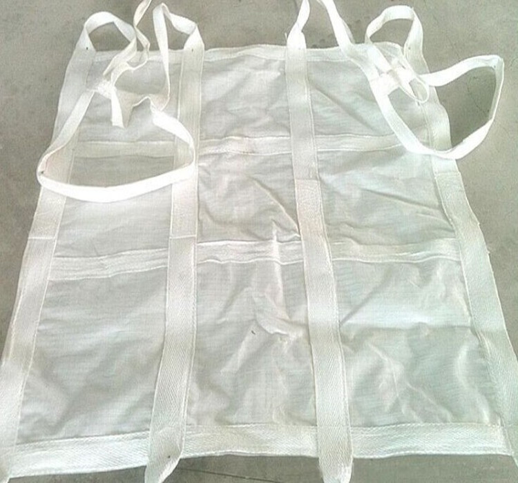 規(guī)格160*170*150cm,材質(zhì)全新料PP,可承重2000kg,底部材料為重180g/㎡的白色集裝布(寬170cm 、長180cm均含10cm縫頭),吊帶為重60g/m的吊帶,吊帶在底部成“井”字形,在底部編織布的邊沿還縫制一圈加強帶(寬4cm、 重20g /m),一條袋子的重量在2.2kg。